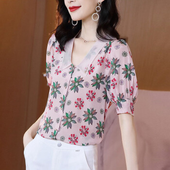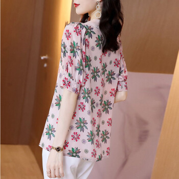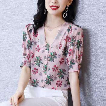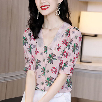 碎花雪纺衫女短袖夏季2020新款娃娃领衬衫洋气小衫法式泡泡袖时尚减龄气质衬衣潮 粉红色 L