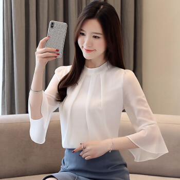 潘歌雪纺衬衫女2020新款女装夏季韩版白色淑女气质纯色宽松五分袖打底衫上衣女R339 白色 S