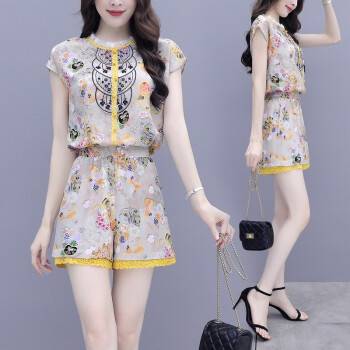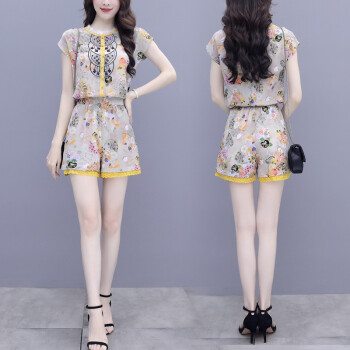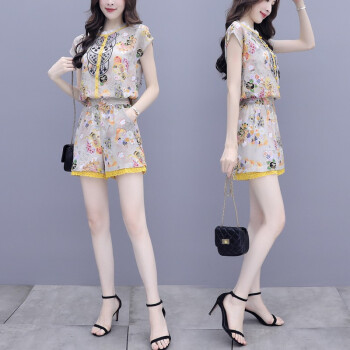双合依恋 2020新款女装夏季职业装两件套裤复古宫廷风刺绣雪纺衫上衣阔腿短裤休闲时尚套装女 8380 黄色套装 M