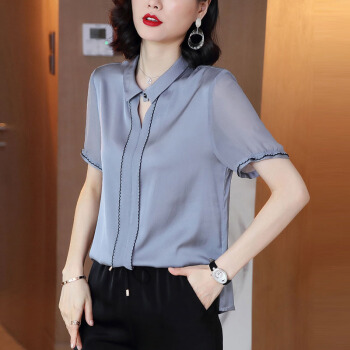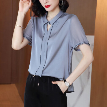 依语幽香休闲衬衫女装2020夏季新款短袖通勤衬衣百搭上衣缎面纯色 浅灰色 L