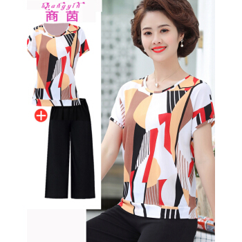 中老年女装>>商茵SY妈妈装套装中老年女装2020年夏款短袖上衣+阔腿裤中年40岁50洋气时尚百搭高贵气质两件套 红色方块套装 2XL(建议105-120斤)
