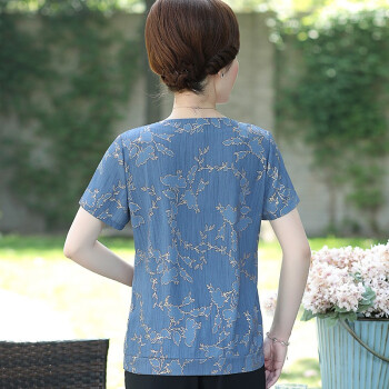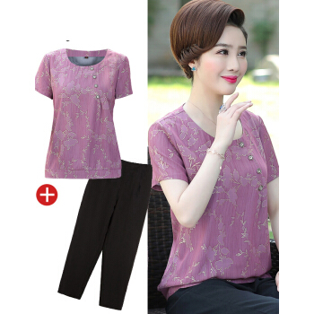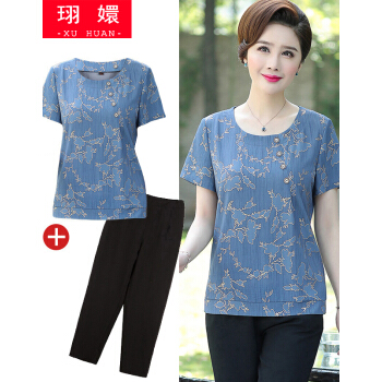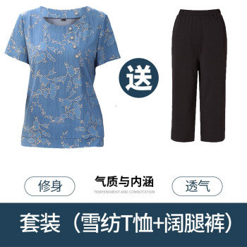 珝嬛中老年女装2020夏装新两件套4050岁中年妇女阔太太短袖t恤女上衣裤子大码妈妈装雪纺衫奶奶套装 蓝色 请拍自身对应码数