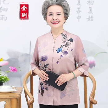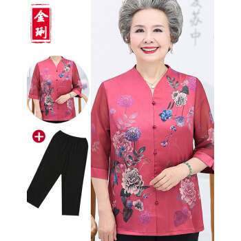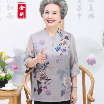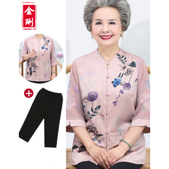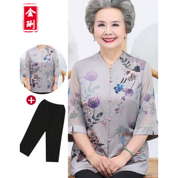 金琍JL中老年女装妈妈装2020奶奶装夏装妈妈唐装中老年人女套装老人衣服胖老太太短袖冰丝衬衫两件套 灰色 2XL【建议100-110斤】
