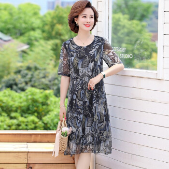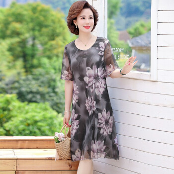 中老年女装>>珝嬛中老年女装大码连衣裙女2020夏装新款宽松短袖中年妇女网纱裙大码休闲碎花裙遮肚妈妈装中长款裙子 1号色【紫色】 此码勿拍.请拍自身对应码数