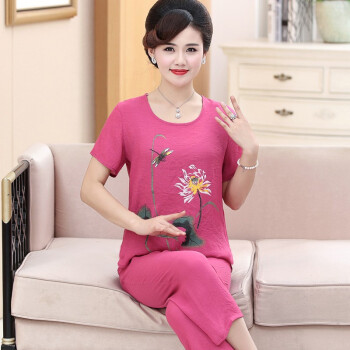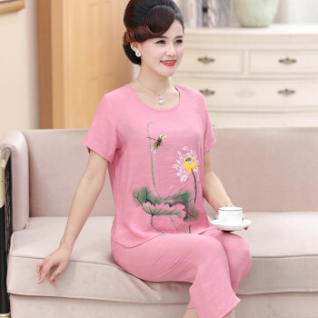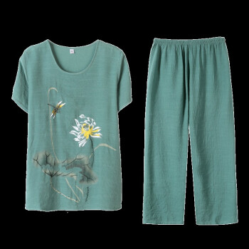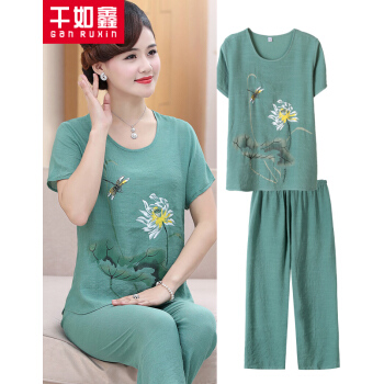 干如鑫中老年女装妈妈装时尚休闲套装女棉麻两件套宽松大码女装4050岁洋气宽松衣T恤休闲运动套装跑步服 豆绿色 2XL(105-125斤)