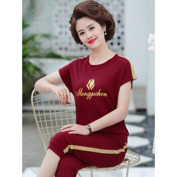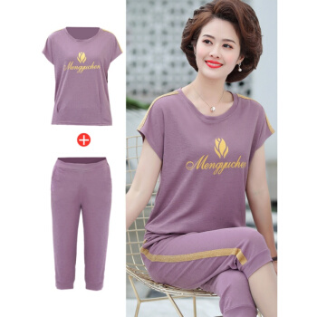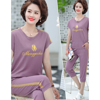 晳馥香中老年女装夏2020新款中年妈妈装夏装短袖T恤中老年大码上衣服休闲运动套装女装 紫色(套装) (请拍对应尺码) |