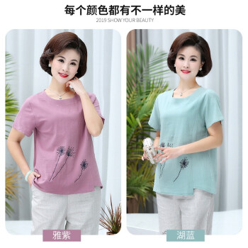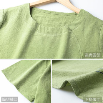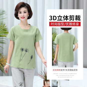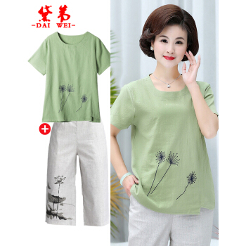 黛苇妈妈装夏装中老年女装休闲运动棉麻套装夏装洋气短袖女装上衣40岁50中年妈妈款时尚两件套大码女装 绿色 XL(90-110斤)