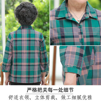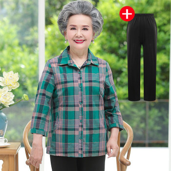 中老年女装>>孝珍老年人女装夏装纯棉九分袖衬衫奶奶装格子衬衣套装中老年妈妈装两件套 绿格子+裤子 2XL码(建议体重105-120斤)