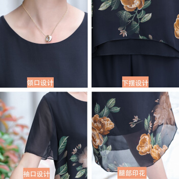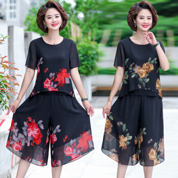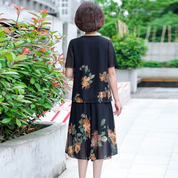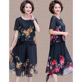 晳馥香中老年女装妈妈夏装两件套连衣裙女大码新款40岁50中年女装雪纺衫短袖t恤洋气套装 红花 (请拍对应尺码)