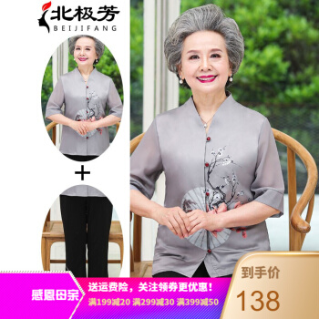 中老年女装>>北极芳 中老年女装奶奶装夏装套装印花妈妈装衬衫2020老年人女士中长袖中国风衬衣 093-2024 灰色套装 2XL【105-120斤】