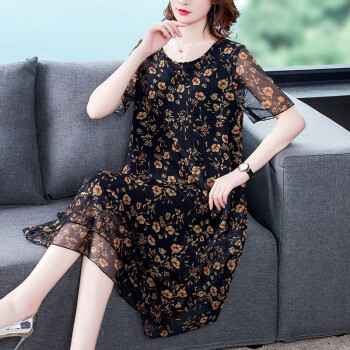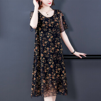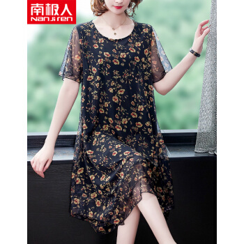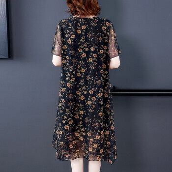 南极人 中年连衣裙2020夏季新款大码中老年女装妈妈装贵夫人高端气质遮肚中长款雪纺碎花裙子 N3-BH358-16025-黑色 3XL |