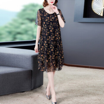 中老年女装>>南极人 中年连衣裙2020夏季新款大码中老年女装妈妈装贵夫人高端气质遮肚中长款雪纺碎花裙子 N3-BH358-16025-黑色 3XL