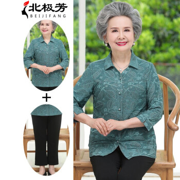 中老年女装>>北极芳 妈妈装中袖衬衫60-80岁中老年女装老太太奶奶装夏装上衣两件套装翻领衬衣104-QH2021 绿色套装 2XL【105-120斤】