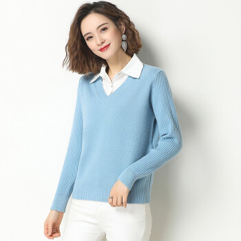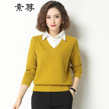 素荨针织衫女套头短款秋装2020年新款衬衫领毛衣女宽松百搭春秋打底衫 黄色15102 M