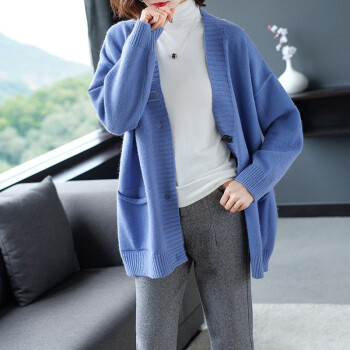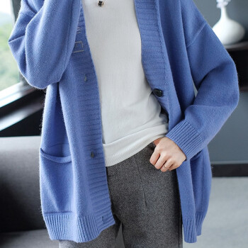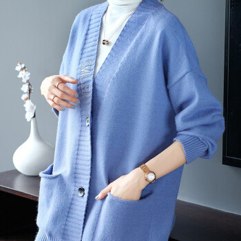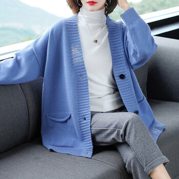 纤丝鸟 TINSINO 针织衫女2020秋冬新款韩版宽松刺绣针织开衫女休闲毛衣通勤毛线衣外套 蓝色 请拍正确尺码 |
