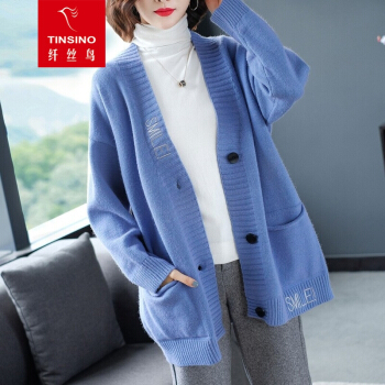 针织衫>>纤丝鸟 TINSINO 针织衫女2020秋冬新款韩版宽松刺绣针织开衫女休闲毛衣通勤毛线衣外套 蓝色 请拍正确尺码