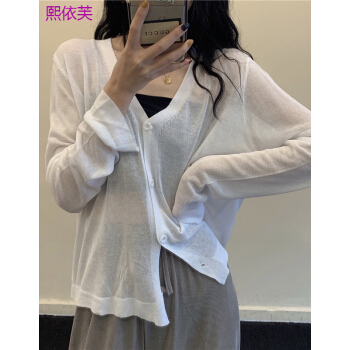 熙依芙针织衫女夏季2020新款小香风v领薄款冰丝bm针织开衫外搭长袖防晒衫上衣女 白色 均码