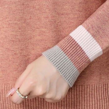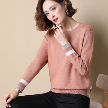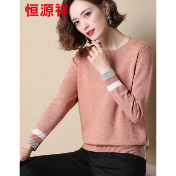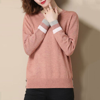 针织衫>>恒源祥针织衫女2020春秋季新款韩版时尚短款圆领针织衫休闲百搭拼色纽扣宽松减龄女上衣888 肉粉 M