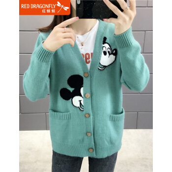 针织衫>>红蜻蜓 针织衫女2020新款秋冬季甜美气质韩版女装开衫V字领宽松型针织毛衣女外套 WL172 绿色 均码