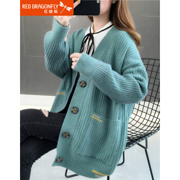 针织衫>>红蜻蜓 针织开衫毛衣女2020新款春秋韩版百搭宽松慵懒风外套时尚针织外搭上衣 WL738 绿蓝 均码