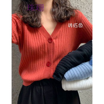 针织衫>>珠珊针织衫女2020新款春秋外搭毛衣小开衫外套女宽松懒慵风V领女装单排扣短款针织衫上衣 7306-砖红色 XL
