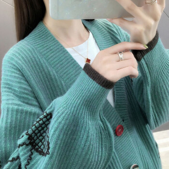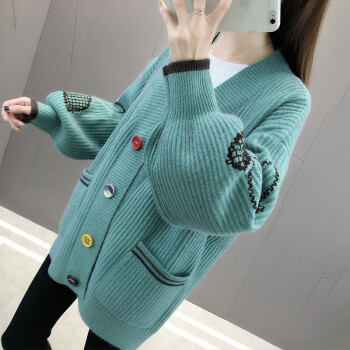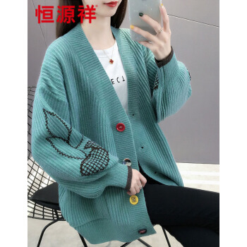 恒源祥针织衫女2020秋季新品时尚慵懒风外搭开衫女灯笼袖刺绣针织衫女韩版宽松毛衣外套女0215 湖蓝 请拍正确尺码