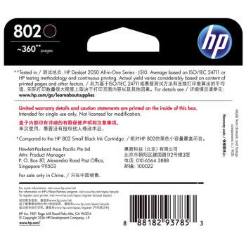 惠普(HP)CH563Z 802 黑色墨盒(适用HP Deskjet 1050/2050/1010/1000/2000/1510/1511) |