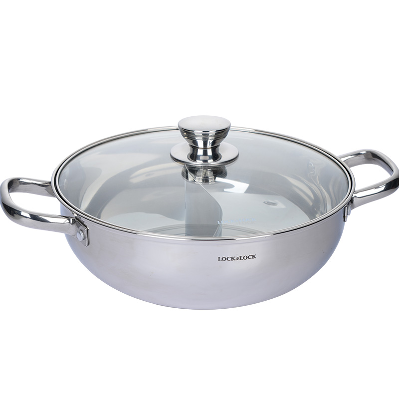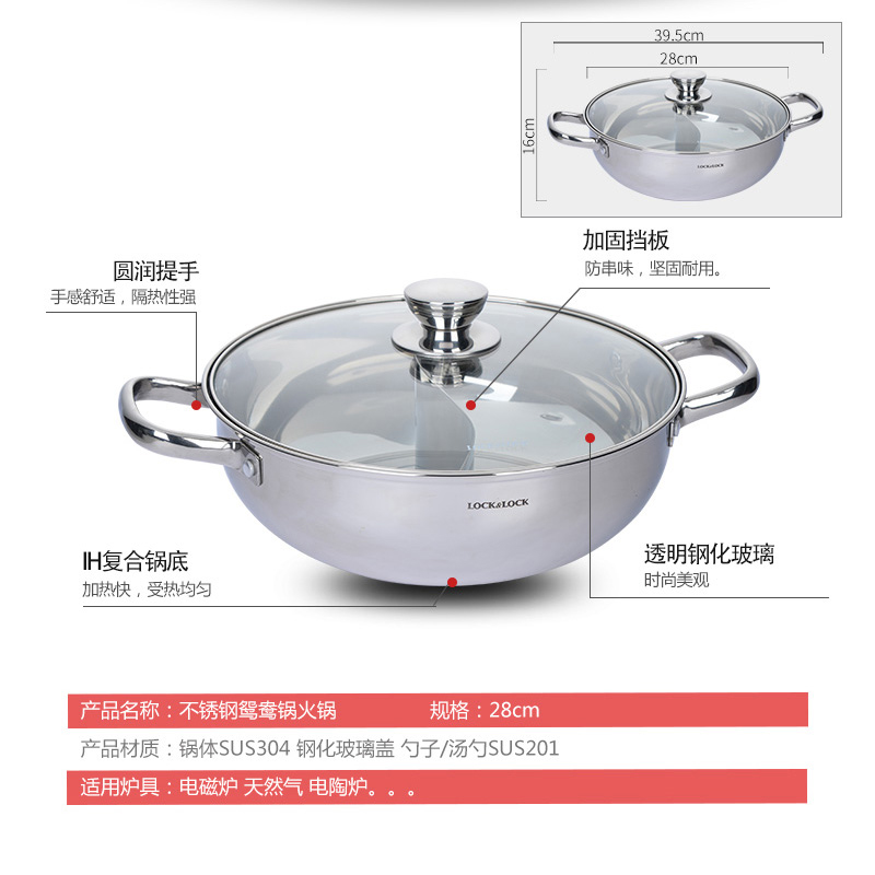 不锈钢加厚电磁炉燃气通用(配汤勺漏勺)鸳鸯火锅 28cm【不锈钢/不锈钢色】