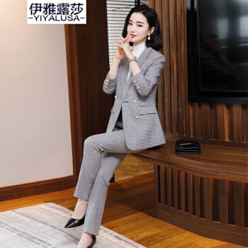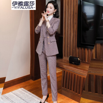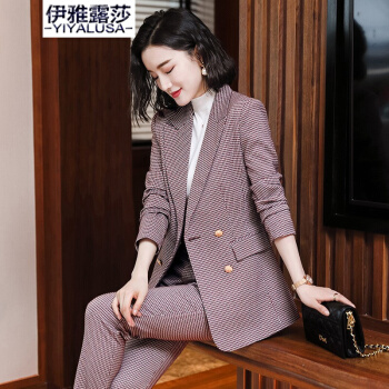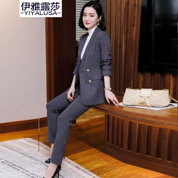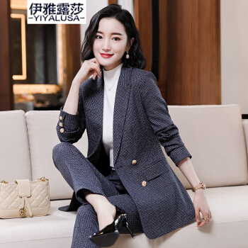 伊雅露莎职业装女装套装小西装女秋季新款时尚休闲外套名媛通勤西服套裤2081 单件蓝格西装 S