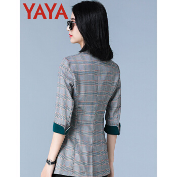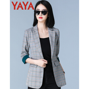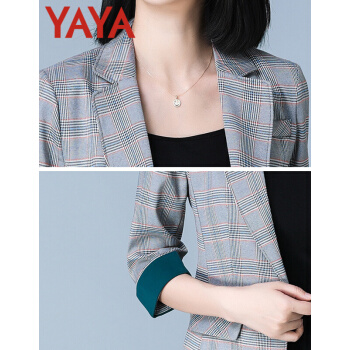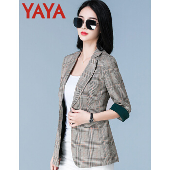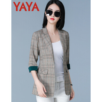 鸭鸭服饰yaya小西装女2020女装秋季新款外套女春秋流行韩版女百搭上衣七分袖 咖啡格 L