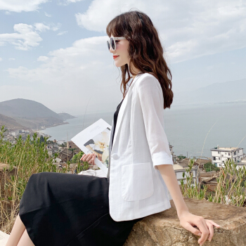 小西装>>樹染潮牌亚麻小西装女薄款透气防晒衣中长款2020夏季新款修身休闲韩版百搭棉麻职业西服大码外套 白色(七分袖) M 体重98至107斤