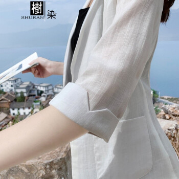 樹染潮牌亚麻小西装女薄款透气防晒衣中长款2020夏季新款修身休闲韩版百搭棉麻职业西服大码外套 白色(七分袖) M 体重98至107斤 |
