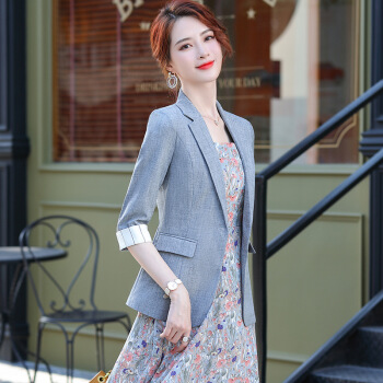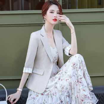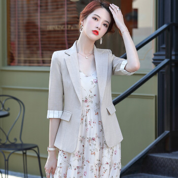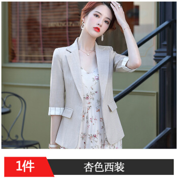 夏天潮流新品 蓝色小西装外套女韩版2020夏季薄款条纹英伦修身时尚职业西服上班可穿 杏色西装 S