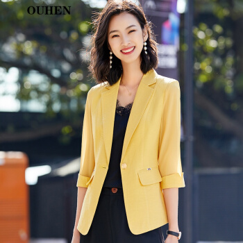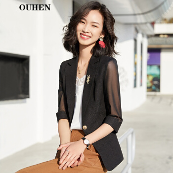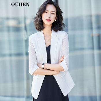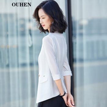 小西装>>OUHEN轻奢品牌女装小西装外套女2020夏季新款薄款白色七分袖韩版休闲网纱拼接西服女上衣 白色中袖西装 L(建议96-105斤)