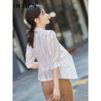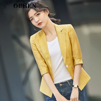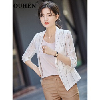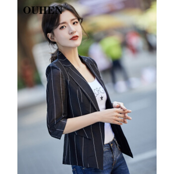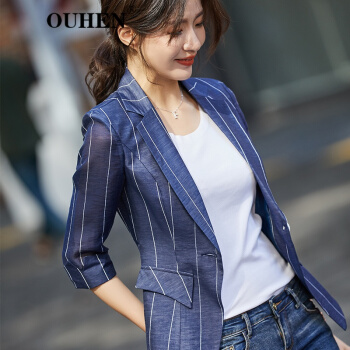 OUHEN高端品牌女装 亚麻小西装外套女2020新款夏薄款休闲小个子韩版条纹西服上衣 蓝色 M