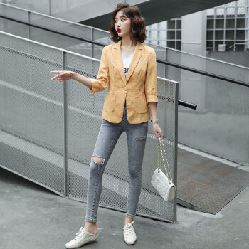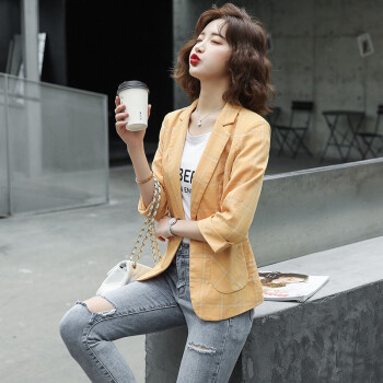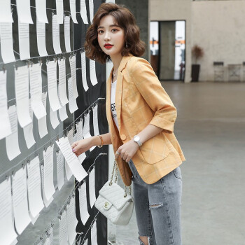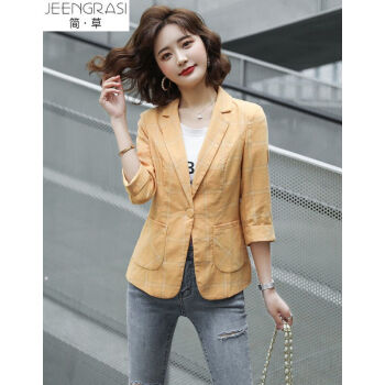 简草 小西装女2020秋装新款韩版时尚通勤简约气质百搭潮流格纹一粒扣七分袖西服外套女X8988 黄色 XL