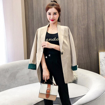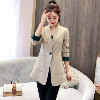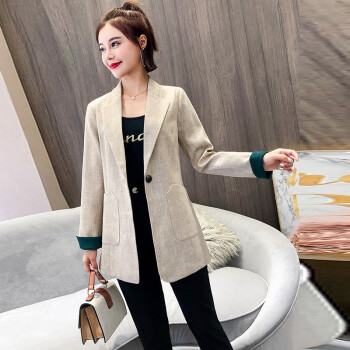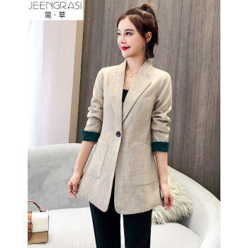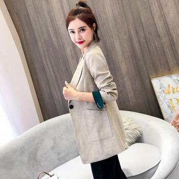 简草 小西装女中长款2020秋季新款时尚潮流宽松显瘦气质休闲韩版长袖一粒扣西服外套女Z911 米色 S