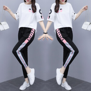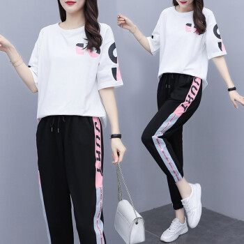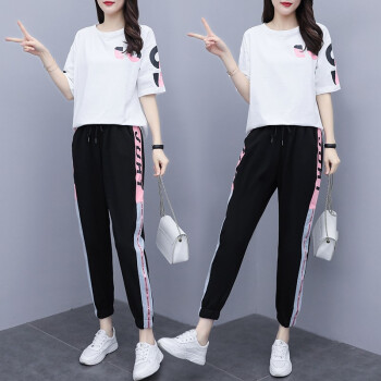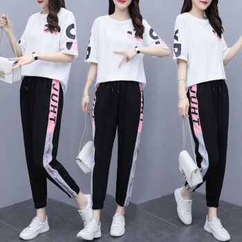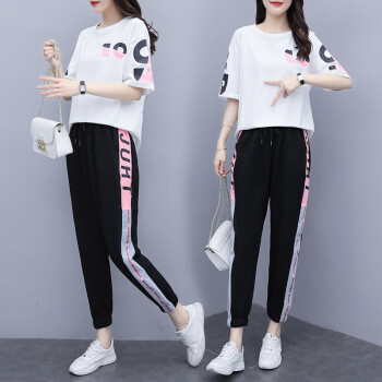睡妍 大码女装套装女夏2020夏季新品加肥加大码胖mm宽松显瘦遮肉印花短袖T恤九分裤休闲运动套装女夏 图片色 XXL(120-140左右)