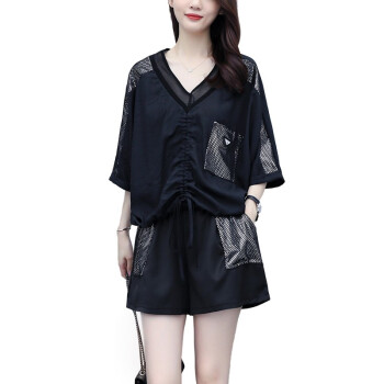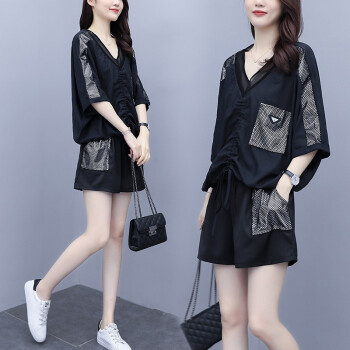 芷依丽 时尚大码胖MM套装女2020夏季新款宽松短袖上衣女T恤休闲阔腿短裤运动两件套 黑色 L