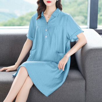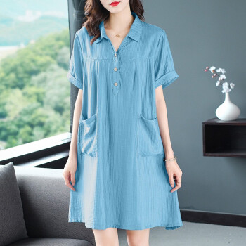 大码女装>>木棉林胖妹妹mm优雅连衣裙加大码女装2020新款夏装洋气减龄翻领宽松遮肚子中长款裙子女H202586 蓝色 XL建议120-140斤