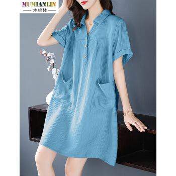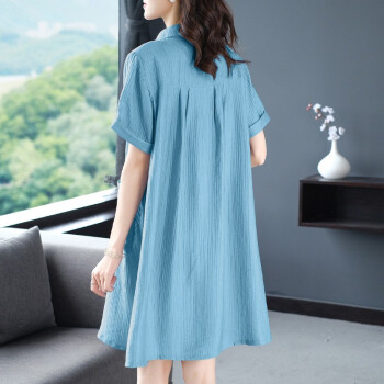 木棉林胖妹妹mm优雅连衣裙加大码女装2020新款夏装洋气减龄翻领宽松遮肚子中长款裙子女H202586 蓝色 XL建议120-140斤 |