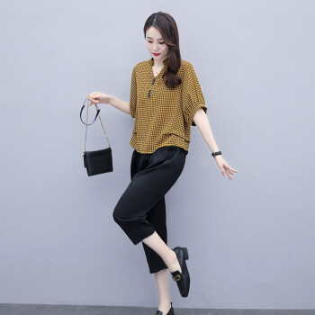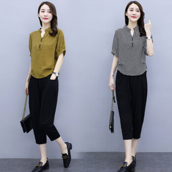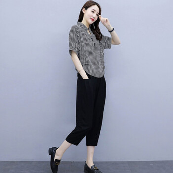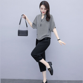 卿依瑟 大码女装棉麻套装女2020年夏季修身显瘦V领格子时尚上衣七分休闲裤俩件套装女潮 黑色 M
