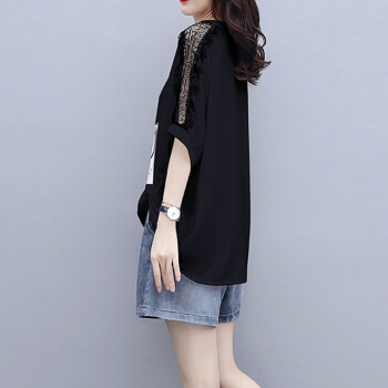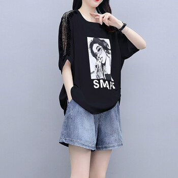 乐英萱大码女装套装2020胖妹妹夏装新款胖人女装显瘦款加肥加大码微胖mm遮肚子宽松T恤+牛仔短裤套装 黑色 M建议90-100斤左右 |