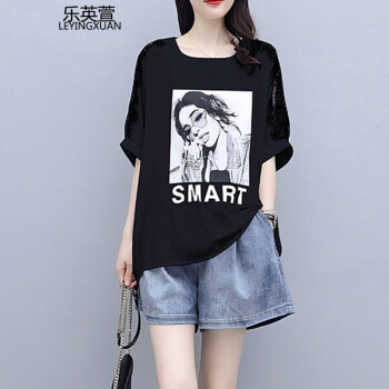大码女装>>乐英萱大码女装套装2020胖妹妹夏装新款胖人女装显瘦款加肥加大码微胖mm遮肚子宽松T恤+牛仔短裤套装 黑色 M建议90-100斤左右