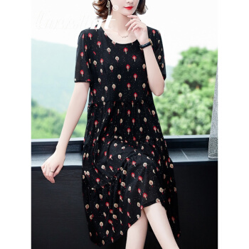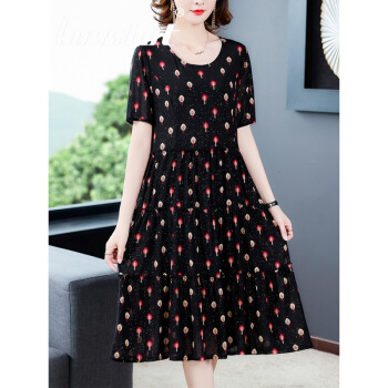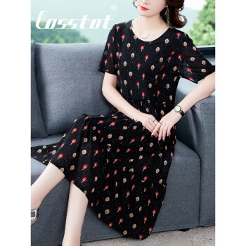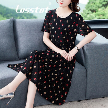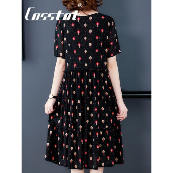 Cosstot轻奢品牌女装 大码高端连衣裙2020新款夏季中年妈妈贵夫人名媛气质遮肚裙子 黑色小树 XL