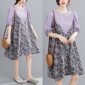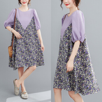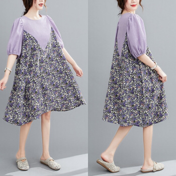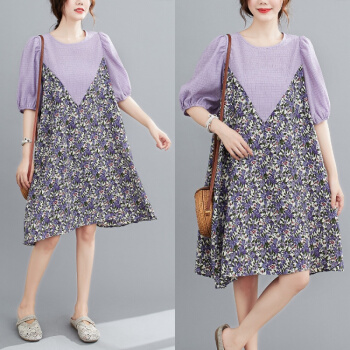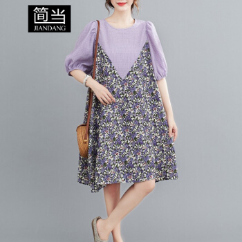 大码女装>>简当2020夏装新款加肥加大码女装胖妹妹MM碎花雪纺连衣裙法式裙宽松显瘦中长款A字裙SFF3456 紫碎花裙 均码( 100-190斤)
