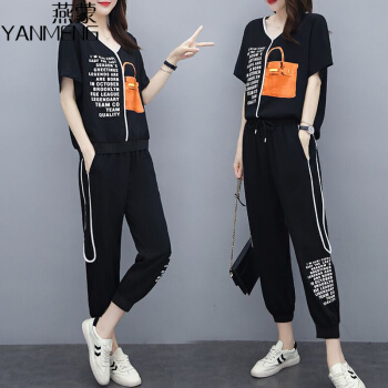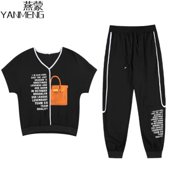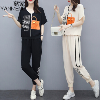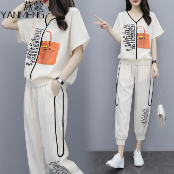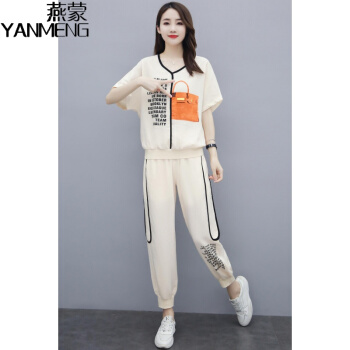 燕蒙 大码女装短袖t恤套装女2020夏季新款加肥加大宽松显瘦时尚胖mm200斤休闲裤运动两件套M21 杏色 2XL【建议135-155斤】