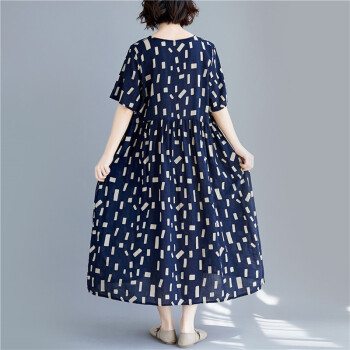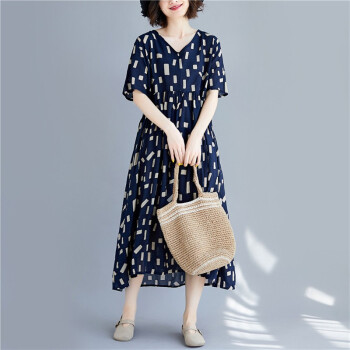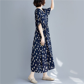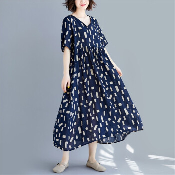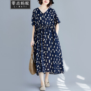 大码女装>>零点蚂蚁2020新款加肥加大码女装胖mm夏装洋气休闲时尚韩版v领收腰遮肉宽松连衣裙胖人女装胖妹妹裙子 图片色 均码【110-200斤】