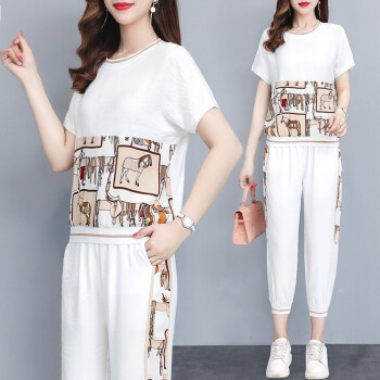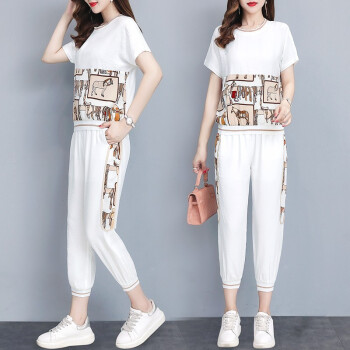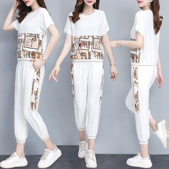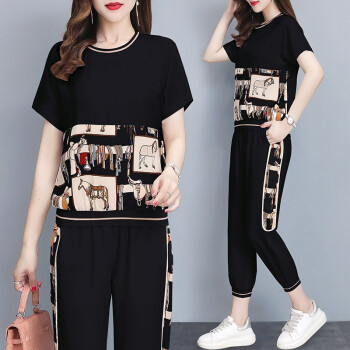 大码女装>>睡妍 大码女装套装女夏2020夏季新品韩版时尚套装减龄洋气宽松显瘦九分裤短袖休闲运动套装两件套女夏 黑色 L(98-110左右)