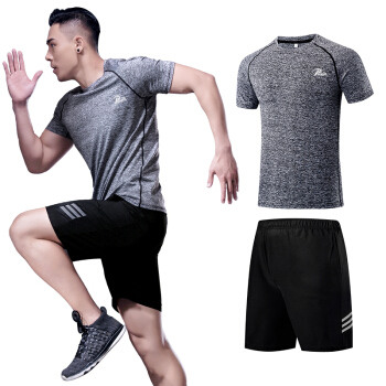 健身服>>普为特POVIT 运动套装男士健身服夏季运动跑步篮球服吸汗透气速干衣短裤短袖 灰黑两件套 XL码 P-824